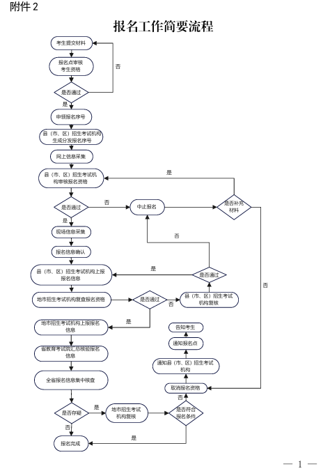 答:报名工作程序包括报名资格初审、生成分发报名序号、网上信息采集、现场信息采集、报名信息确认、报名信息汇总核验等环节(报名工作简要流程见附件2)。